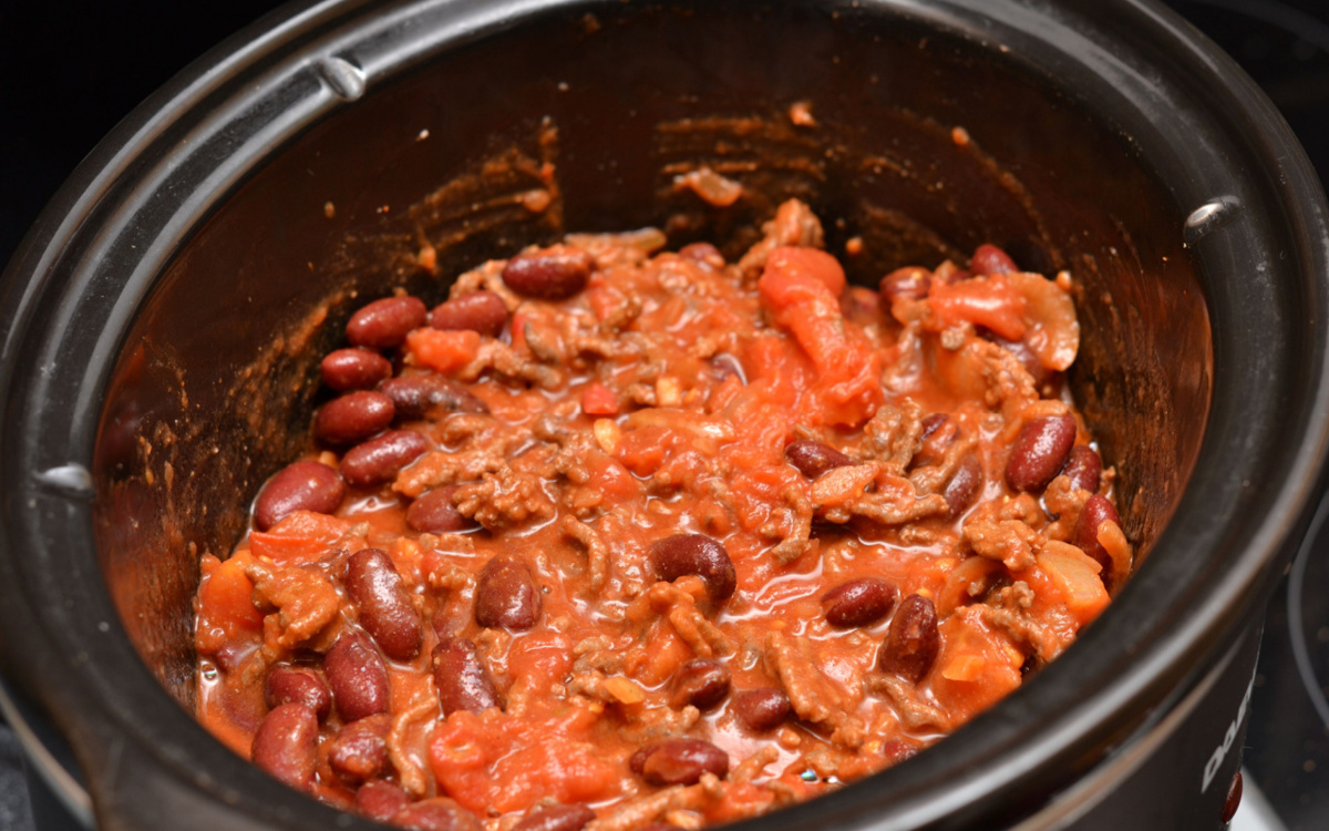 - Add the pepper and chopped tomatoes, and cook on low for around 5 hours. Stir in the beans and cook for another 30-60 minutes. Season to taste.