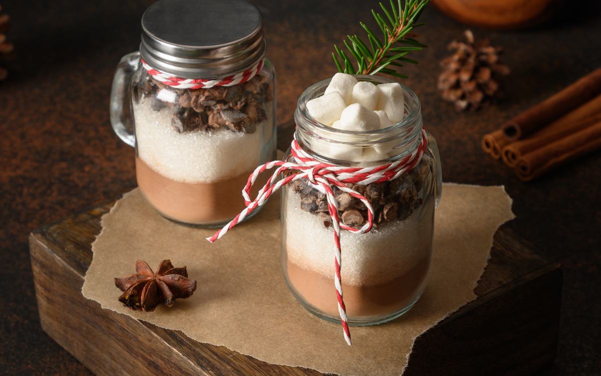 Gifts don't need to be shop bought, we love these home-made cocoa jars, the perfect gift to show you care. Plus- they're super easy to make and only need a few ingredients.