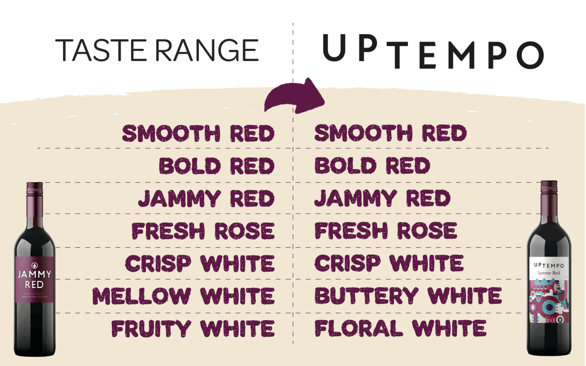 The Taste range has been elevated to UpTempo with a lot of the flavour profiles such as Fresh Rose and Crisp White keeping their name. We’ve also added a new flavour profile – Buttery White.