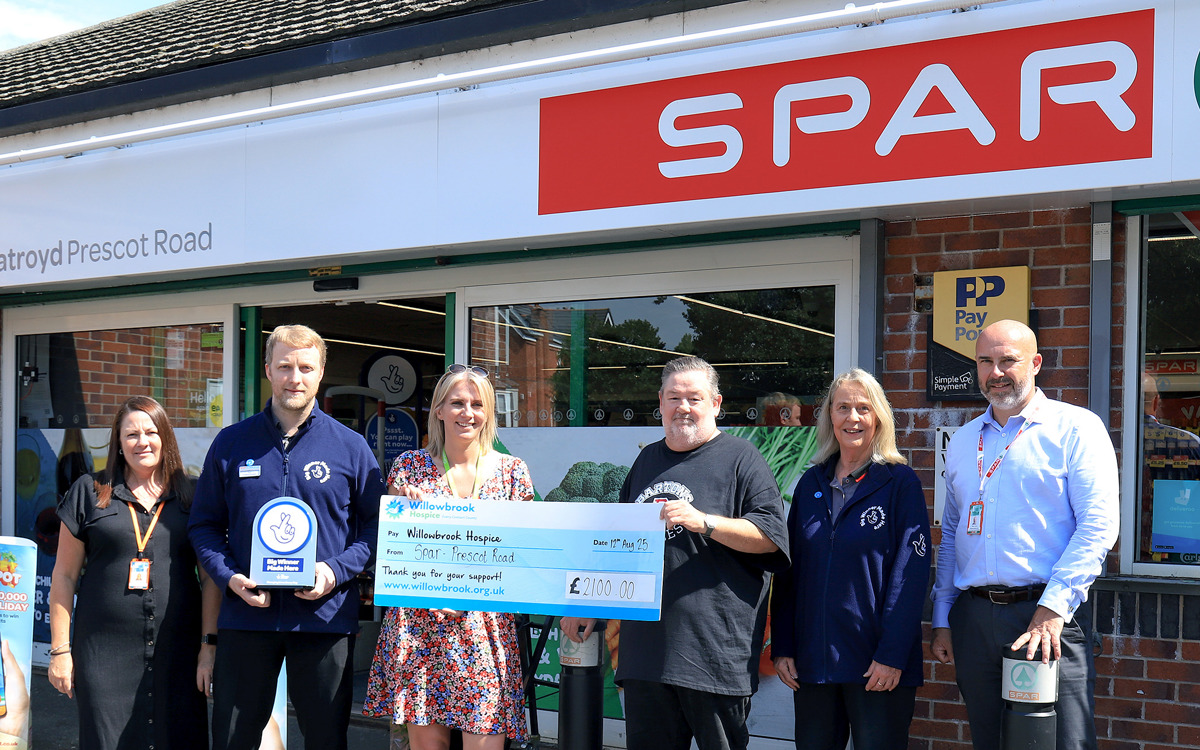 SPAR Prescot Road’s team chose to donate £2,100 to Willowbrook Hospice which serves St Helens and Knowsley, and TV actor and comedian Johnny Vegas who is a regular customer visited in his official capacity as charity Patron alongside Hospice staff to receive the cheque.