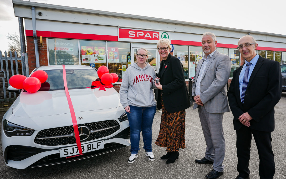 Nicola Poland, an NHS 111 telephone operator, collected the keys for her brand new 73-plate Mercedes CLA250e car outside SPAR Ditchfield Road in Widnes in front of members of her family.
