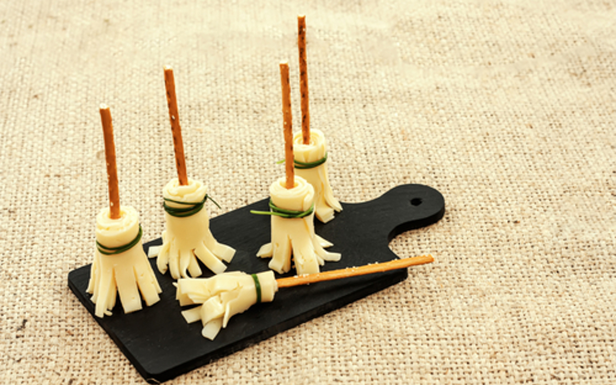 Simply slice a string cheese in half and thinly dice sections three quarters of the way up all the way around to create a broomstick like design; insert a pretzel stick on top and tie with a little chive for this cheesy snack.