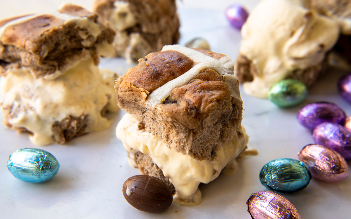 Choose your favourite ice cream flavour, whether it’s vanilla, chocolate or mint, and spoon into the middle of two toasted hot cross buns. It couldn’t be simpler! Add chocolate or caramel sauce if you’re feeling a little extra and throw in some sprinkles too.