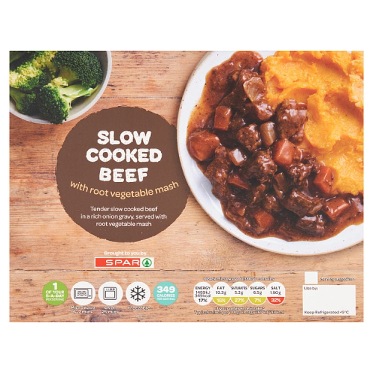- Tender slow cooked beef in a rich onion gravy, served with root vegetable mash