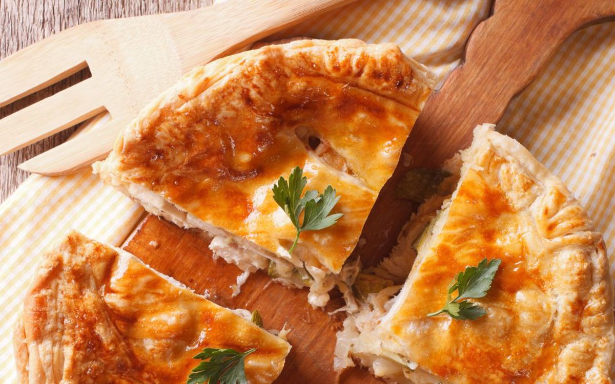 Notes:Â you can make a vegetarian option of this pie, just omit the chicken and add cooked, chopped veggies instead. Peas and carrots go well with this recipe too. Best served with salad on the side.