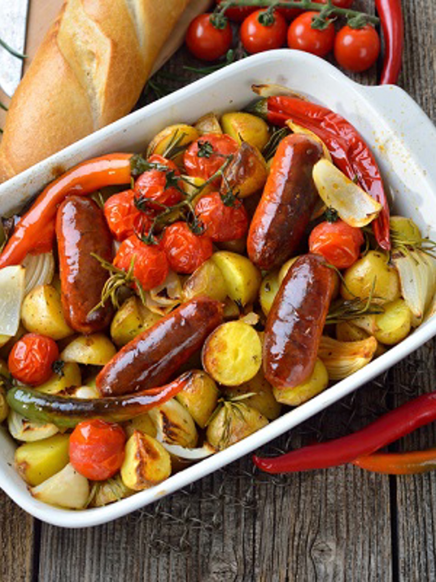 - Heat a tablespoon of oil in a large, lidded pan, add 8 sausages and 2 sliced red onions and cook over a medium for 10 minutes until brown.