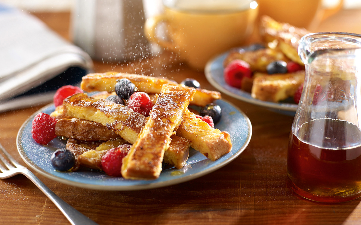 - To serve cut the French toast into finger sticks and divide between 2 plates, add the fresh raspberries and blueberries.