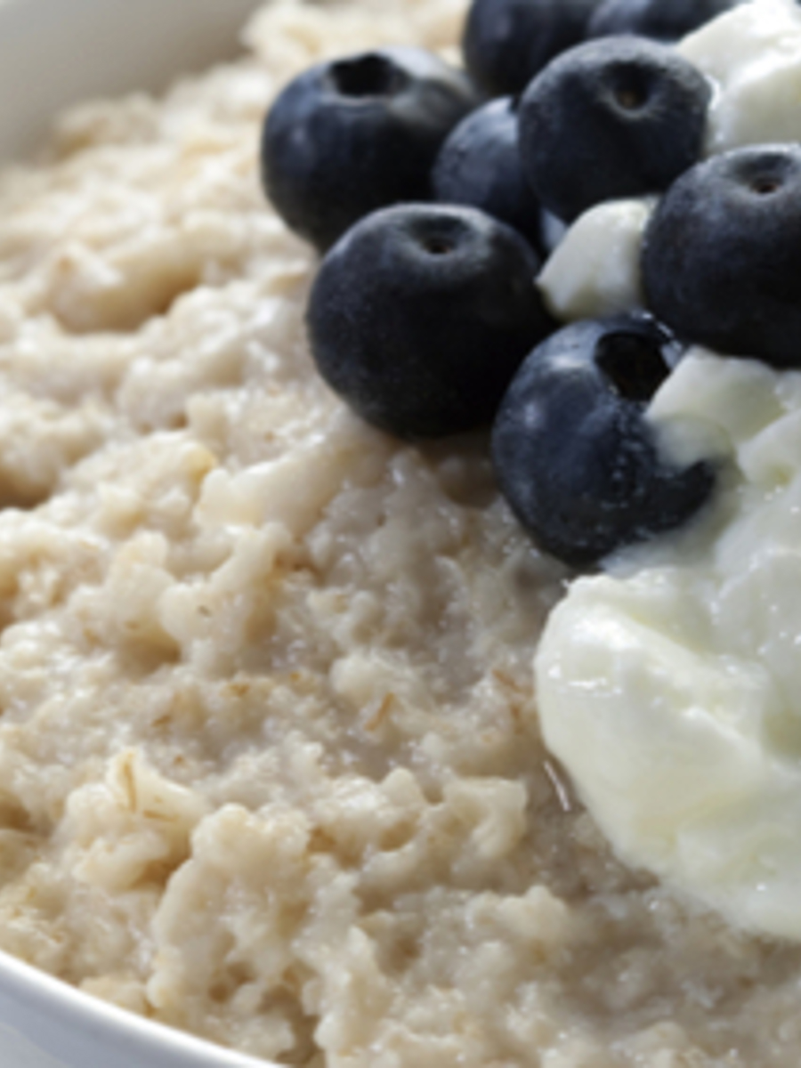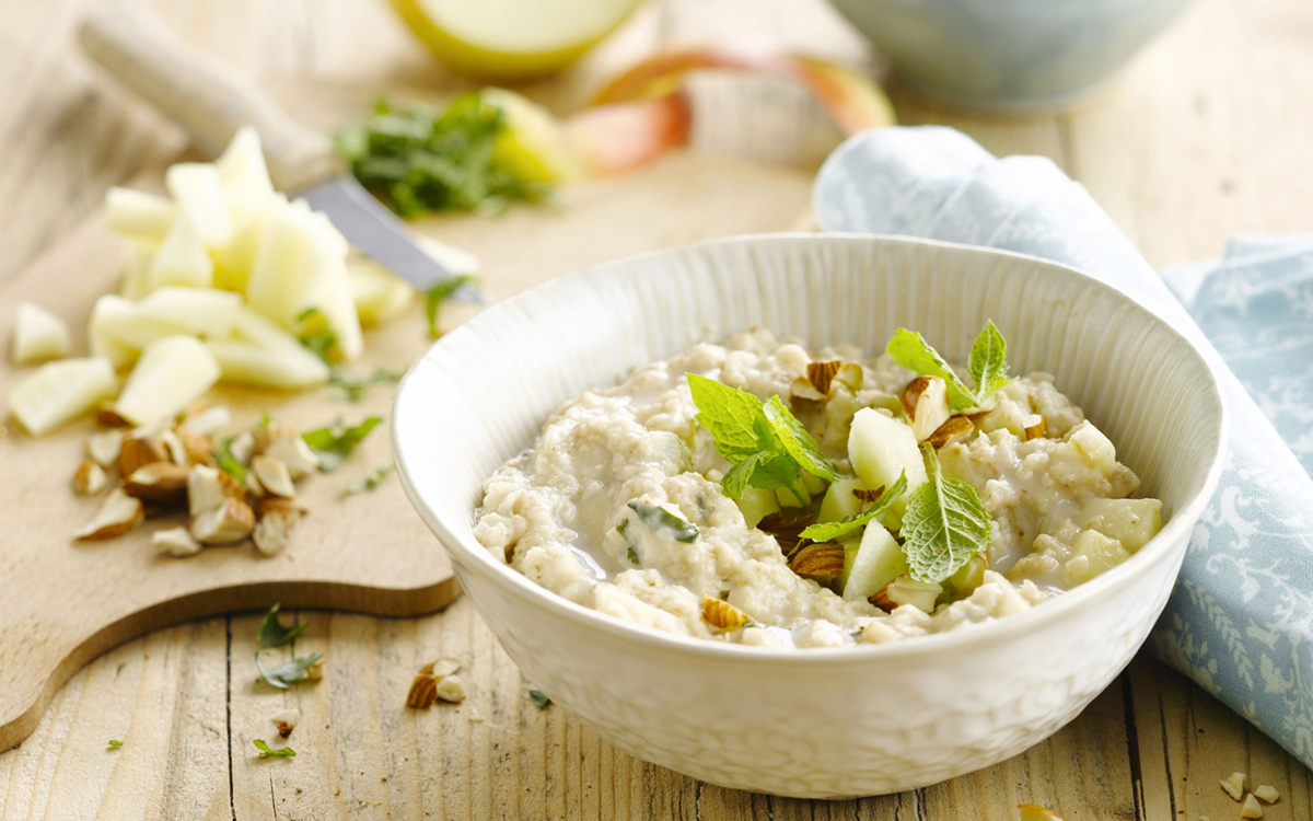 - Divide the apple between 4 bowls, pour the porridge over it and then sprinkle on the chopped almonds. Add a sprig of mint as a final flourish.