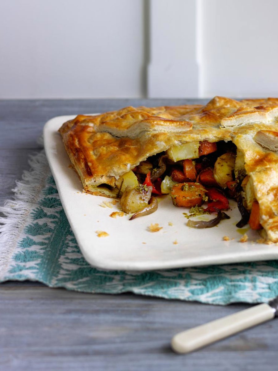 - Carefully remove the dish from the oven and pour in the batter. Scatter over the roasted vegetables. Transfer back to the oven and bake your vegetarian stuffed Yorkshire pudding for 30 minutes or until risen and golden.