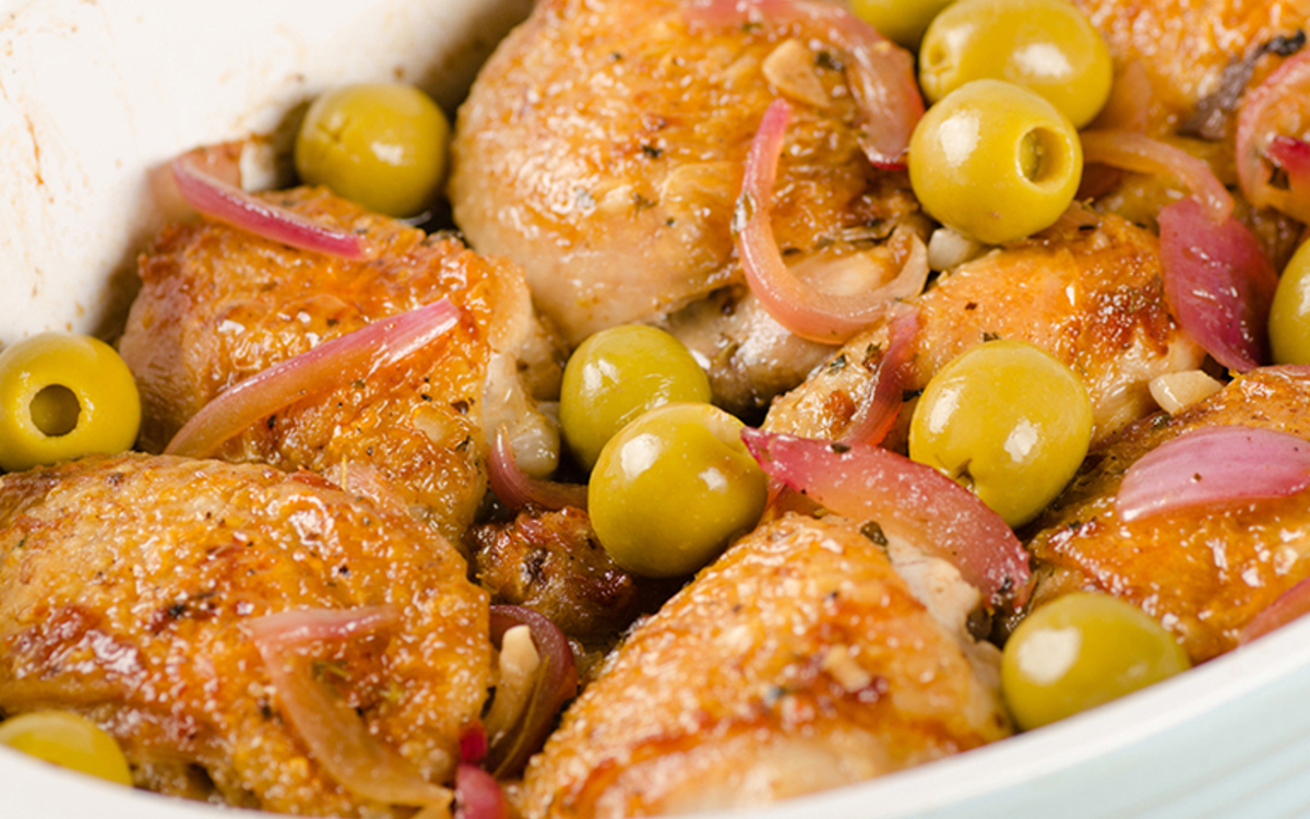 - Placing the chicken on a baking sheet, lift the skin away from the meat using a knife. Stuff your olive and onion mixture under the skin and then place the skin back over the chicken to cover.