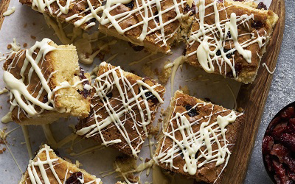 Our blondie recipe makes gooey white chocolate dessert, perfect for snacking. The cranberries add a little tartness but feel free to swap for raspberries if that's what you have to hand.
