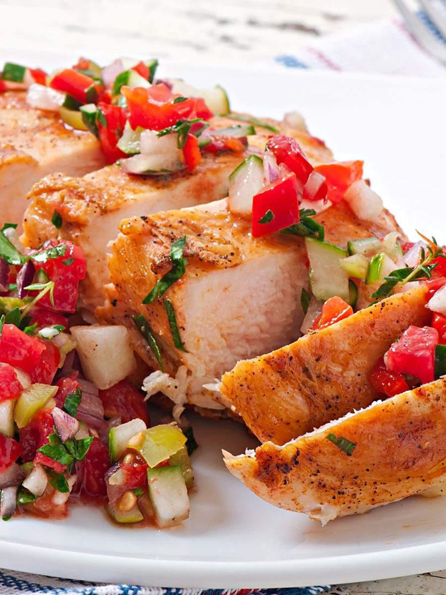 - Start by preheating the oven to 180⁰. While it’s heating, slice your 3 boneless skinless chicken breasts into even chunks.